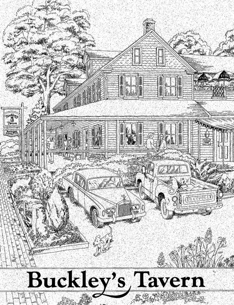 A sketch of Buckley’s Tavern with a Rolls Royce in one parking spot and a pickup truck with a dog in another space says it all. “Once you walk in the door, you’re not a customer; you’re not a CEO, which we have plenty; you’re not a landscaper; you’re just a Buckley’s guest,” he said. The menu does not change too often.