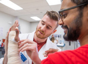 Students in the JWU Physician Assistant program learn different methods of applying splints, hopefully not needed in actual practice for culinary arts students! (2023 Photo: Mike Cohea/JWU)