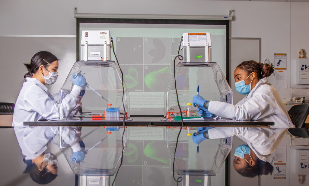 Undergrad students Kim Sacaza and Christine Wong work with Prof. Christos Dimos on a research project using portable clean rooms in the Molecular Biology Lab located in the Bowen Center. (2022 Photo: Mike Cohea/JWU)